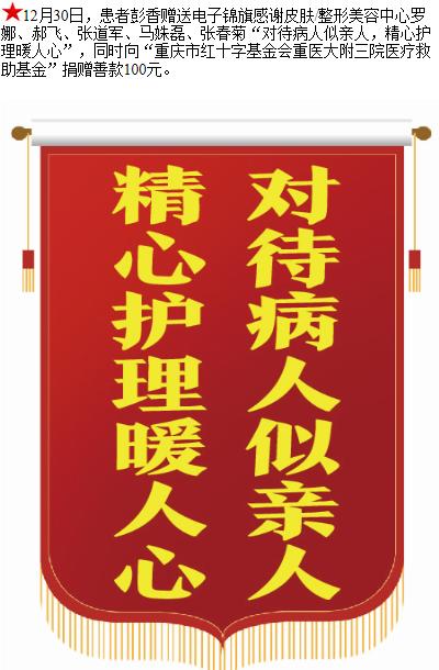 患者彭香赠送电子锦旗感谢皮肤/整形美容中心罗娜等人,并向医疗救助基金捐赠善款100元。-锦旗-患者心声-患者服务-重庆医科大学附属第三医院【官方网站】