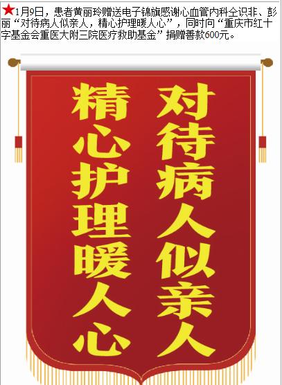 患者黄丽玲赠送电子锦旗感谢心血管内科仝识非等人,并向医疗救助基金捐赠善款600元。-锦旗-患者心声-患者服务-重庆医科大学附属第三医院【官方网站】