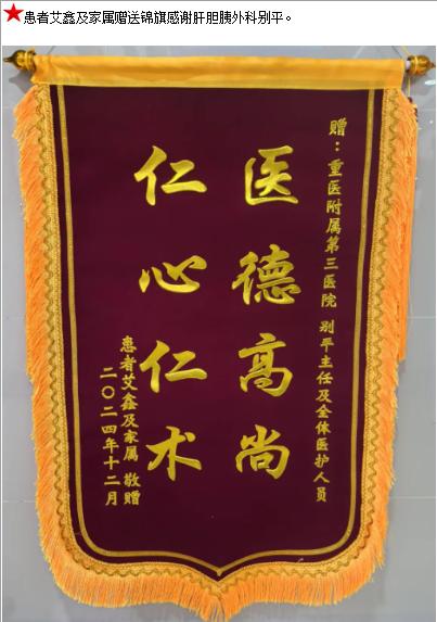 患者艾鑫及家属赠送锦旗感谢肝胆胰外科别平。-锦旗-患者心声-患者服务-重庆医科大学附属第三医院【官方网站】