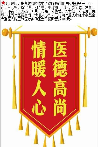 患者封浪赠送电子锦旗感谢肝胆胰外科别平等人,并向医疗救助基金捐赠善款100元。-锦旗-患者心声-患者服务-重庆医科大学附属第三医院【官方网站】