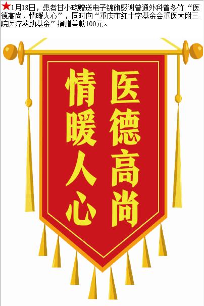 患者甘小琼赠送电子锦旗感谢普通外科曾冬竹,并向医疗救助基金捐赠善款100元。-锦旗-患者心声-患者服务-重庆医科大学附属第三医院【官方网站】