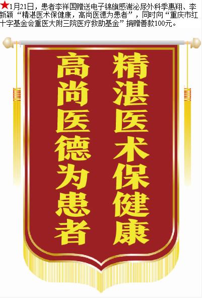 患者李祥国赠送电子锦旗感谢泌尿外科季惠翔等人,并向医疗救助基金捐赠善款100元。-锦旗-患者心声-患者服务-重庆医科大学附属第三医院【官方网站】