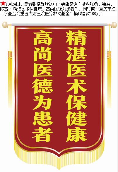患者张德群赠送电子锦旗感谢血液科张勇等人,并向医疗救助基金捐赠善款100元。-锦旗-患者心声-患者服务-重庆医科大学附属第三医院【官方网站】