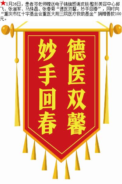 患者邓老师赠送电子锦旗感谢皮肤/整形美容中心郝飞等人,并向医疗救助基金捐赠善款100元。-锦旗-患者心声-患者服务-重庆医科大学附属第三医院【官方网站】