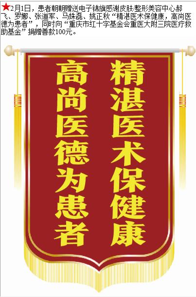 患者朝朝赠送电子锦旗感谢皮肤/整形美容中心郝飞等人,并向医疗救助基金捐赠善款100元。-锦旗-患者心声-患者服务-重庆医科大学附属第三医院【官方网站】