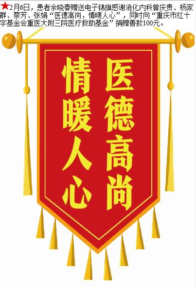 患者余晓春赠送电子锦旗感谢消化内科曾庆贵等人,并向医疗救助基金捐赠善款100元。-锦旗-患者心声-患者服务-重庆医科大学附属第三医院【官方网站】
