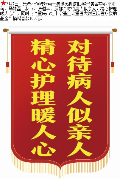 患者小鱼赠送电子锦旗感谢皮肤/整形美容中心邓雨萌等人,并向医疗救助基金捐赠善款100元。-锦旗-患者心声-患者服务-重庆医科大学附属第三医院【官方网站】
