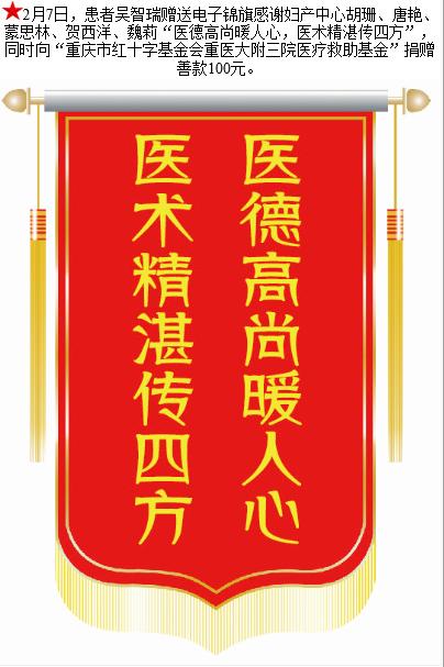 患者吴智瑞赠送电子锦旗感谢妇产中心胡珊等人,并向医疗救助基金捐赠善款100元。-锦旗-患者心声-患者服务-重庆医科大学附属第三医院【官方网站】