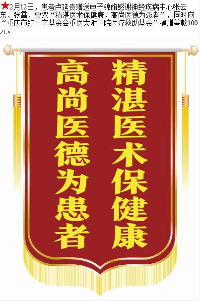 患者卢延贵赠送电子锦旗感谢神经疾病中心张云东等人,并向医疗救助基金捐赠善款100元。-锦旗-患者心声-患者服务-重庆医科大学附属第三医院【官方网站】