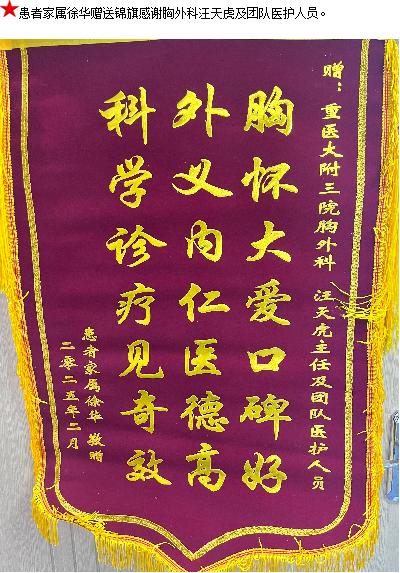 患者家属徐华赠送锦旗感谢胸外科汪天虎及团队医护人员。-锦旗-患者心声-患者服务-重庆医科大学附属第三医院【官方网站】