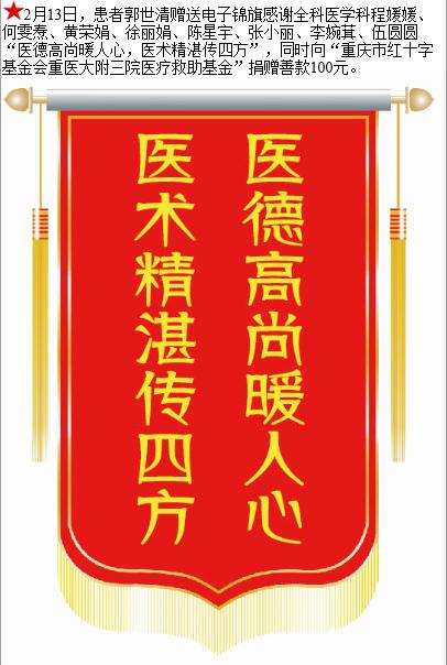 患者郭世清赠送电子锦旗感谢全科医学科程媛媛等人,并向医疗救助基金捐赠善款100元。-锦旗-患者心声-患者服务-重庆医科大学附属第三医院【官方网站】