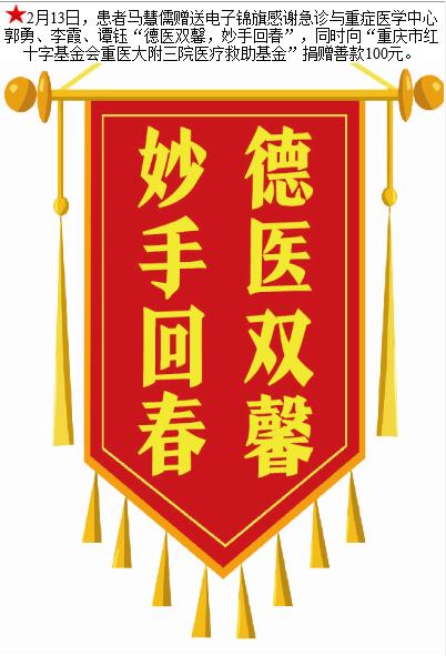 患者马慧儒赠送电子锦旗感谢急诊与重症医学中心郭勇等人,并向医疗救助基金捐赠善款100元。-锦旗-患者心声-患者服务-重庆医科大学附属第三医院【官方网站】