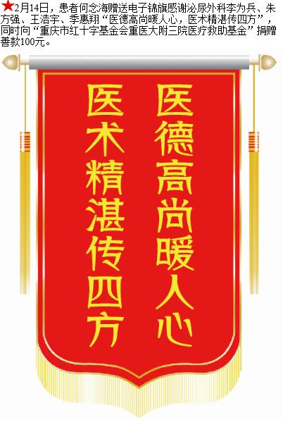 患者何念海赠送电子锦旗感谢泌尿外科李为兵等人,并向医疗救助基金捐赠善款100元。-锦旗-患者心声-患者服务-重庆医科大学附属第三医院【官方网站】