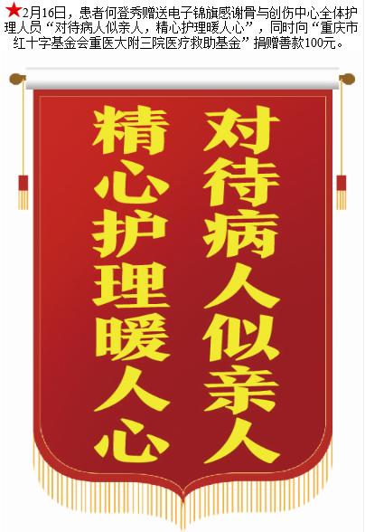 患者何登秀赠送电子锦旗感谢骨与创伤中心全体护理人员,并向医疗救助基金捐赠善款100元。-锦旗-患者心声-患者服务-重庆医科大学附属第三医院【官方网站】