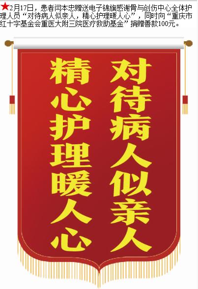 患者闫本忠赠送电子锦旗感谢骨与创伤中心全体护理人员,并向医疗救助基金捐赠善款100元。-锦旗-患者心声-患者服务-重庆医科大学附属第三医院【官方网站】