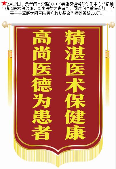 患者闫本忠赠送电子锦旗感谢骨与创伤中心马纪坤,并向医疗救助基金捐赠善款200元。-锦旗-患者心声-患者服务-重庆医科大学附属第三医院【官方网站】