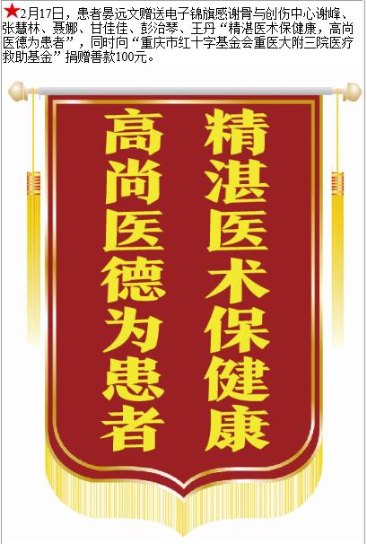 患者晏远文赠送电子锦旗感谢骨与创伤中心谢峰等人,并向医疗救助基金捐赠善款100元。-锦旗-患者心声-患者服务-重庆医科大学附属第三医院【官方网站】