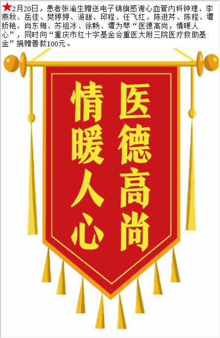 患者张渝生赠送电子锦旗感谢心血管内科钟理等人,并向医疗救助基金捐赠善款100元。-锦旗-患者心声-患者服务-重庆医科大学附属第三医院【官方网站】