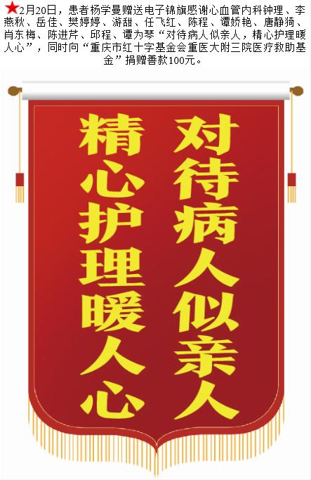 患者杨学曼赠送电子锦旗感谢心血管内科钟理等人,并向医疗救助基金捐赠善款100元。-锦旗-患者心声-患者服务-重庆医科大学附属第三医院【官方网站】