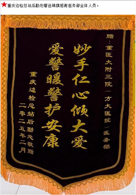 重庆边检总站后勤处赠送锦旗感谢医务部全体人员。-锦旗-患者心声-患者服务-重庆医科大学附属第三医院【官方网站】