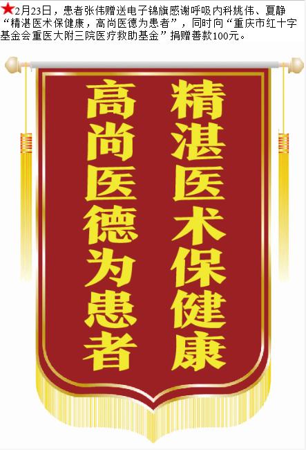 患者张伟赠送电子锦旗感谢呼吸内科姚伟等人,并向医疗救助基金捐赠善款100元。-锦旗-患者心声-患者服务-重庆医科大学附属第三医院【官方网站】