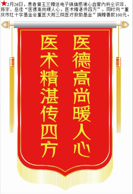 患者曾玉兰赠送电子锦旗感谢心血管内科仝识非等人,并向医疗救助基金捐赠善款100元。-锦旗-患者心声-患者服务-重庆医科大学附属第三医院【官方网站】