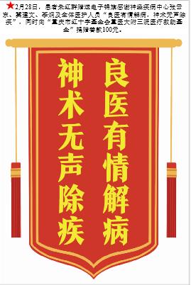 患者朱红群赠送电子锦旗感谢神经疾病中心张云东等人,并向医疗救助基金捐赠善款100元。-锦旗-患者心声-患者服务-重庆医科大学附属第三医院【官方网站】