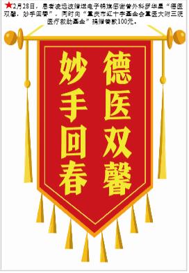 患者凌远波赠送电子锦旗感谢普外科罗华星,并向医疗救助基金捐赠善款100元。-锦旗-患者心声-患者服务-重庆医科大学附属第三医院【官方网站】