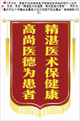 患者郑远洋赠送电子锦旗感谢神经疾病中心张云东等人,并向医疗救助基金捐赠善款100元。