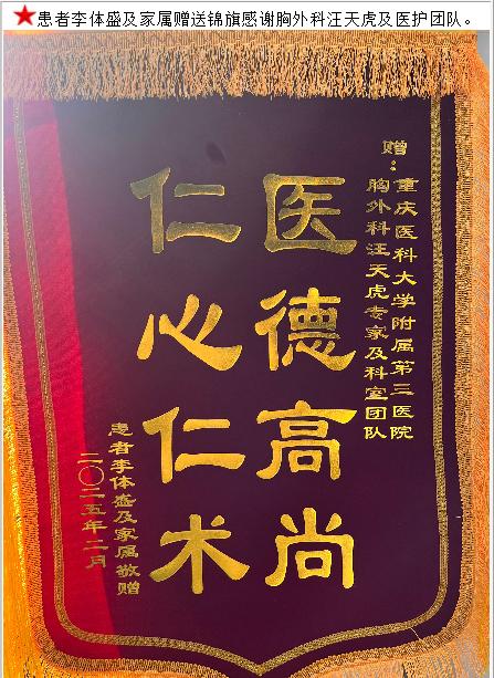 患者李体盛赠送锦旗感谢胸外科汪天虎及医护团队。-锦旗-患者心声-患者服务-重庆医科大学附属第三医院【官方网站】