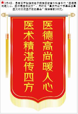 患者王甲珍赠送电子锦旗感谢普外科曾冬竹,并向医疗救助基金捐赠善款100元。-锦旗-患者心声-患者服务-重庆医科大学附属第三医院【官方网站】