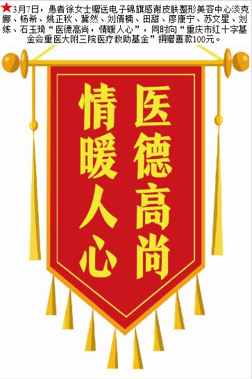 患者徐女士赠送电子锦旗感谢皮肤整形美容中心淡克娜等人,并向医疗救助基金捐赠善款100元。-锦旗-患者心声-患者服务-重庆医科大学附属第三医院【官方网站】