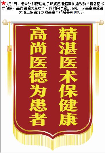 患者张颖赠送电子锦旗感谢超声科熊秀勤等人,并向医疗救助基金捐赠善款100元。-锦旗-患者心声-患者服务-重庆医科大学附属第三医院【官方网站】