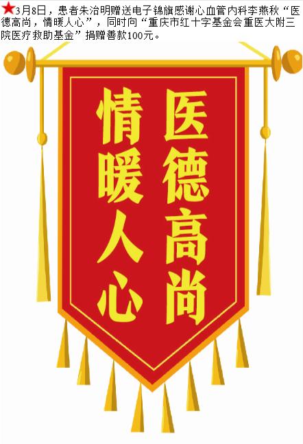 患者朱治明赠送电子锦旗感谢心血管内科李燕秋,并向医疗救助基金捐赠善款100元。-锦旗-患者心声-患者服务-重庆医科大学附属第三医院【官方网站】
