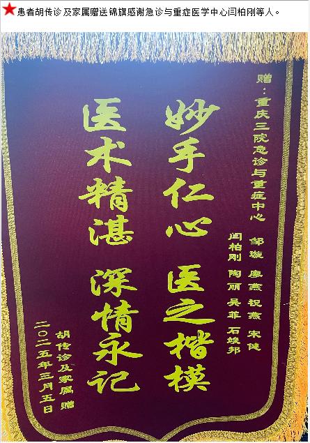 患者胡传诊及家属赠送锦旗感谢急诊与重症医学中心闫柏刚等人。-锦旗-患者心声-患者服务-重庆医科大学附属第三医院【官方网站】