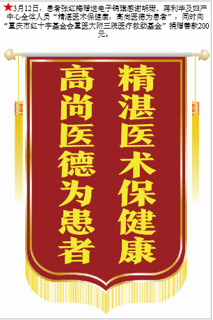 患者张红梅赠送电子锦旗感谢妇产中心胡珊等人,并向医疗救助基金捐赠善款200元。-锦旗-患者心声-患者服务-重庆医科大学附属第三医院【官方网站】