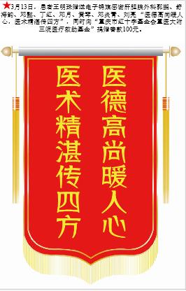 患者王明珠赠送电子锦旗感谢肝胆胰外科郭鹏等人,并向医疗救助基金捐赠善款100元。-锦旗-患者心声-患者服务-重庆医科大学附属第三医院【官方网站】