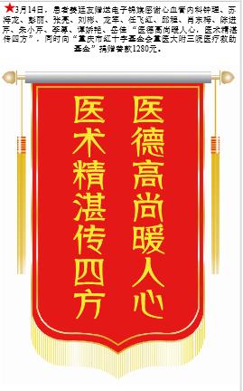 患者姜廷友赠送电子锦旗感谢心血管内科钟理等人,并向医疗救助基金捐赠善款1280元。