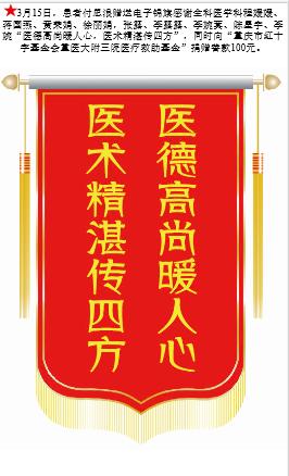 患者付思浪赠送电子锦旗感谢全科医学科程媛媛等人,并向医疗救助基金捐赠善款100元。