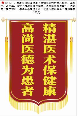 患者张雅婷赠送电子锦旗感谢妇产中心胡姗等人,并向医疗救助基金捐赠善款100元。-锦旗-患者心声-患者服务-重庆医科大学附属第三医院【官方网站】