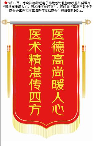 患者陈春赠送电子锦旗感谢乳腺甲状腺外科谭令,并向医疗救助基金捐赠善款100元。-锦旗-患者心声-患者服务-重庆医科大学附属第三医院【官方网站】
