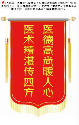 患者刘强赠送电子锦旗感谢肝胆胰外科别平,并向医疗救助基金捐赠善款100元。-锦旗-患者心声-患者服务-重庆医科大学附属第三医院【官方网站】
