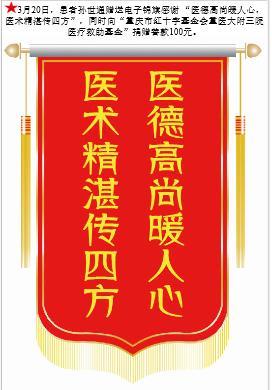 患者孙世通赠送电子锦旗感谢肝胆胰外科丁钧等人,并向医疗救助基金捐赠善款100元。-锦旗-患者心声-患者服务-重庆医科大学附属第三医院【官方网站】