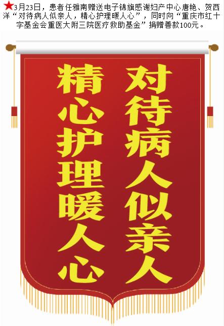 患者任雅南赠送电子锦旗感谢妇产中心唐艳等人,并向医疗救助基金捐赠善款100元。-锦旗-患者心声-患者服务-重庆医科大学附属第三医院【官方网站】