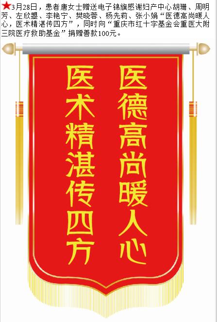 患者唐女士赠送电子锦旗感谢妇产中心胡珊等人,并向医疗救助基金捐赠善款100元。-锦旗-患者心声-患者服务-重庆医科大学附属第三医院【官方网站】