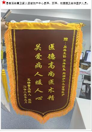 患者玉映雪及家人赠送锦旗感谢妇产中心易萍、苏萍、向媛媛及全体医护人员。