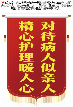 患者牟易婷赠送电子锦旗感谢妇产中心王亚萍,并向医疗救助基金捐赠善款100元。-锦旗-患者心声-患者服务-重庆医科大学附属第三医院【官方网站】