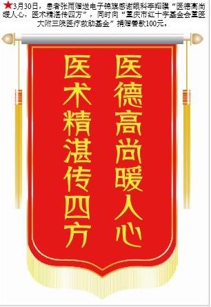 患者张雨赠送电子锦旗感谢眼科李翔骥,并向医疗救助基金捐赠善款100元。-锦旗-患者心声-患者服务-重庆医科大学附属第三医院【官方网站】