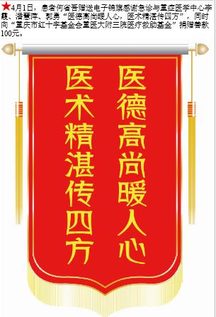 患者何省吾赠送电子锦旗感谢急诊与重症医学中心李霞等人,并向医疗救助基金捐赠善款100元。-锦旗-患者心声-患者服务-重庆医科大学附属第三医院【官方网站】