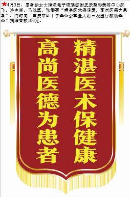 患者徐女士赠送电子锦旗感谢肤整形美容中心郝飞等人,并向医疗救助基金捐赠善款100元。-锦旗-患者心声-患者服务-重庆医科大学附属第三医院【官方网站】